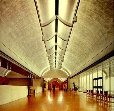 圖:美術館內部,懸掛在天花頂部“人”字型的反射器,把日光引進室內,均勻反射到兩側弧形的清水混凝土面上。