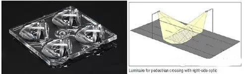 LEDIL開發了一個全新TIR光學產品是2×2陣列模組,每個LED獨立但是組合在一起是產生一個非對稱的光束,這個突破了IES限制的光束圖形需求應用。這款STRADA--2×2產品是針對性應用開發,光型包括各種路燈和投光燈等需求,其中有一款是為人行橫道的光學需求專門開發,包括兼顧行人安全照明也能減少司機感受到最少的眩光,非對稱的光度分布意味著減少直射司機的光線,減少迎面回車的視覺壓力,相反的是相反,一個燈桿安裝的燈具必須將光投射光束到人行橫道的中心點并沿縱向在交通流的方向,在LEDIL提供的案例應用里,斑馬線路面照度為38-41lx,使用的是OSRAMOSLONSquare這類LED。
